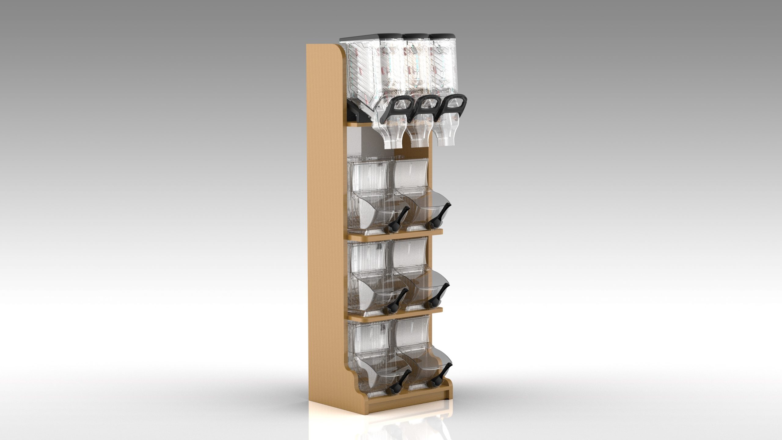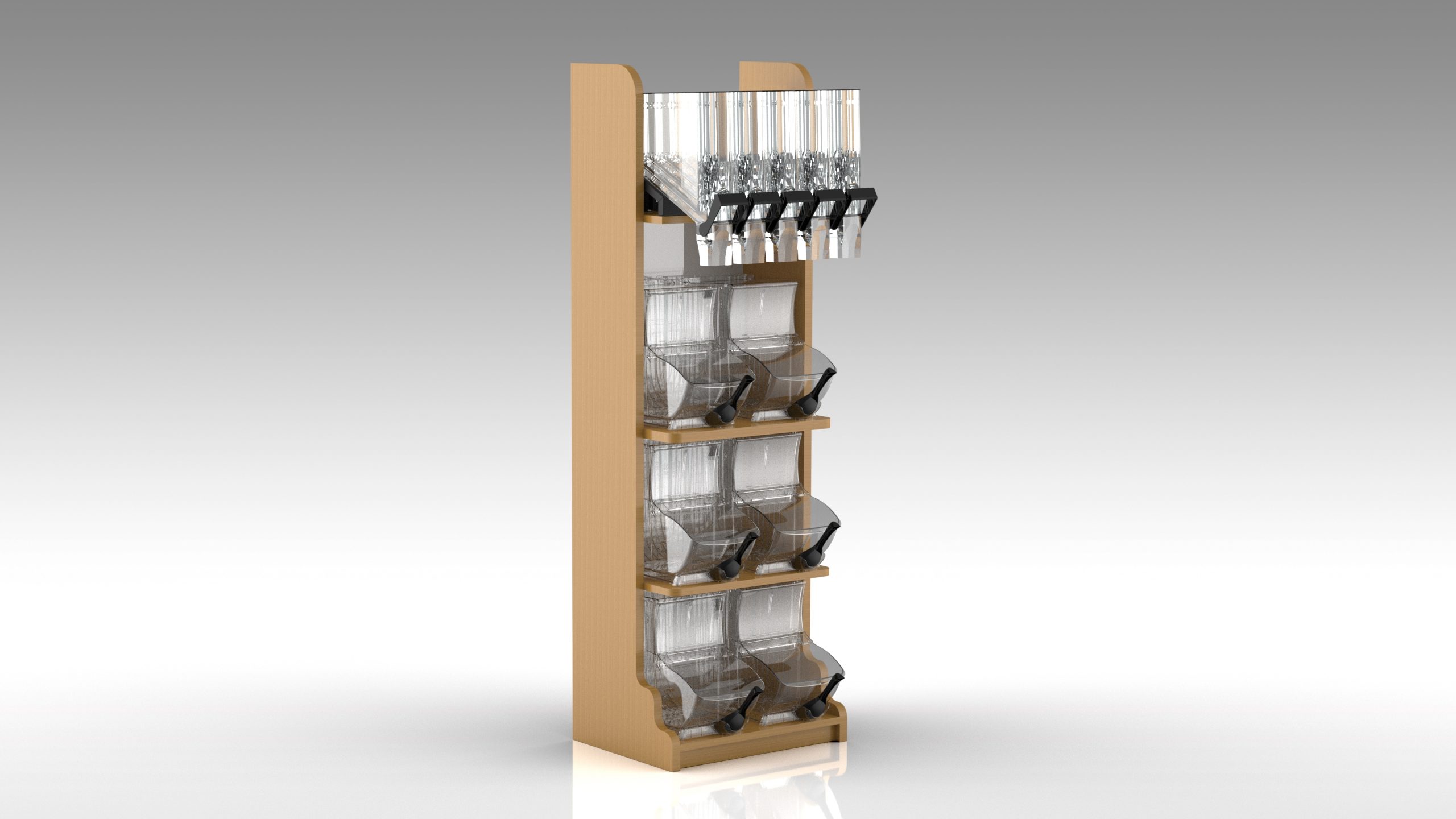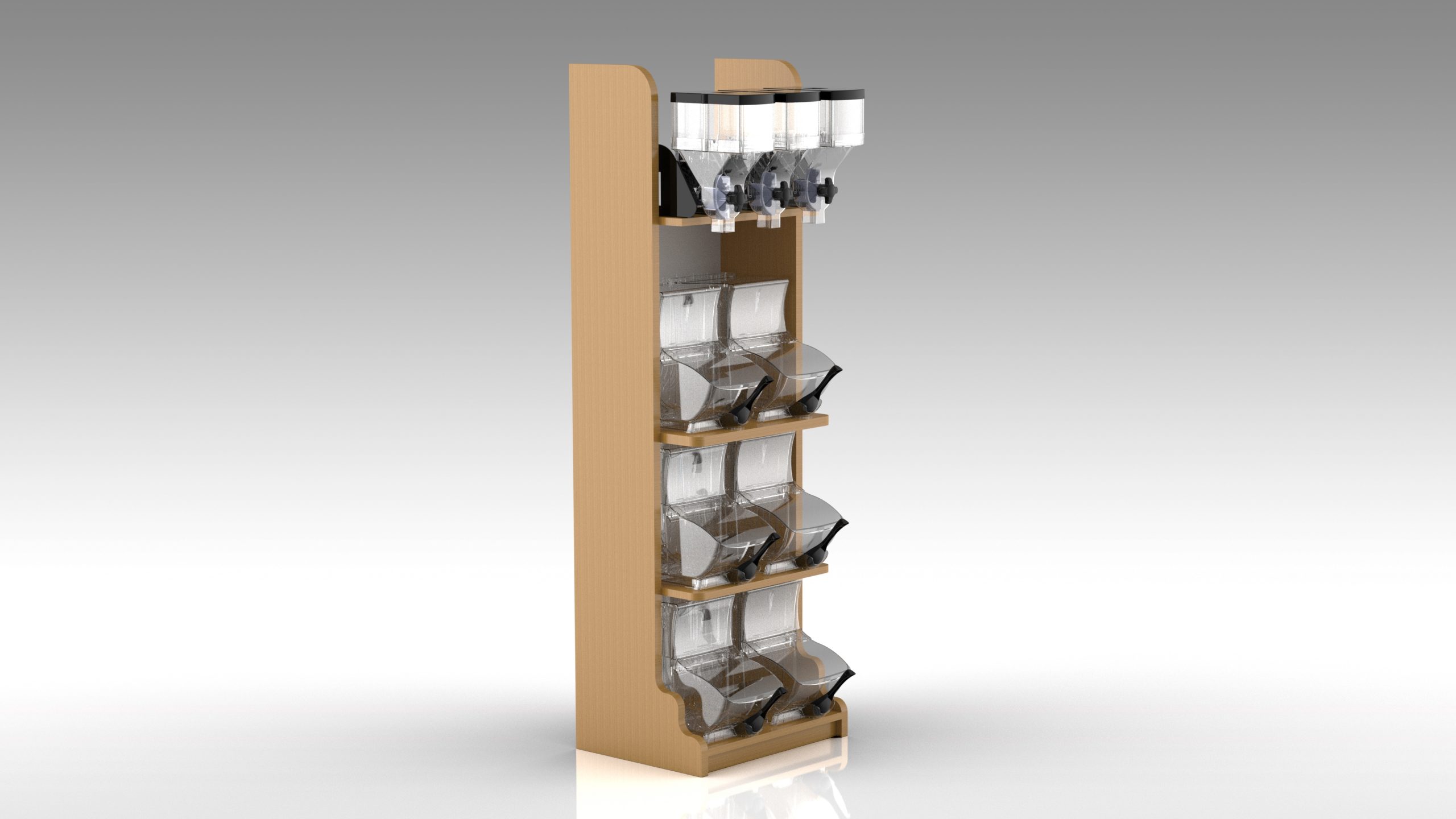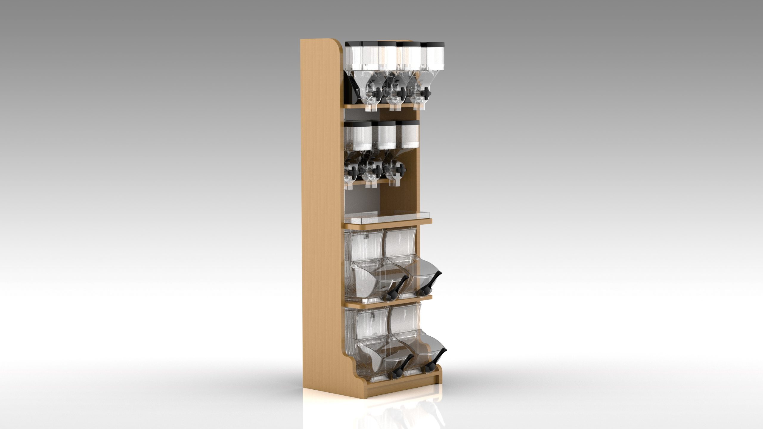 L’étagère TITO permet une mise en place facile et rapide. Elle dispose de plusieurs configurations d’installation offrant la mise en place de distributeurs à poignée, de distributeurs à moulin et de bacs à pelle. Elle se différencie des autres par une structure avec joues ayant plusieurs choix de matière : sapin, épicéa, brut.