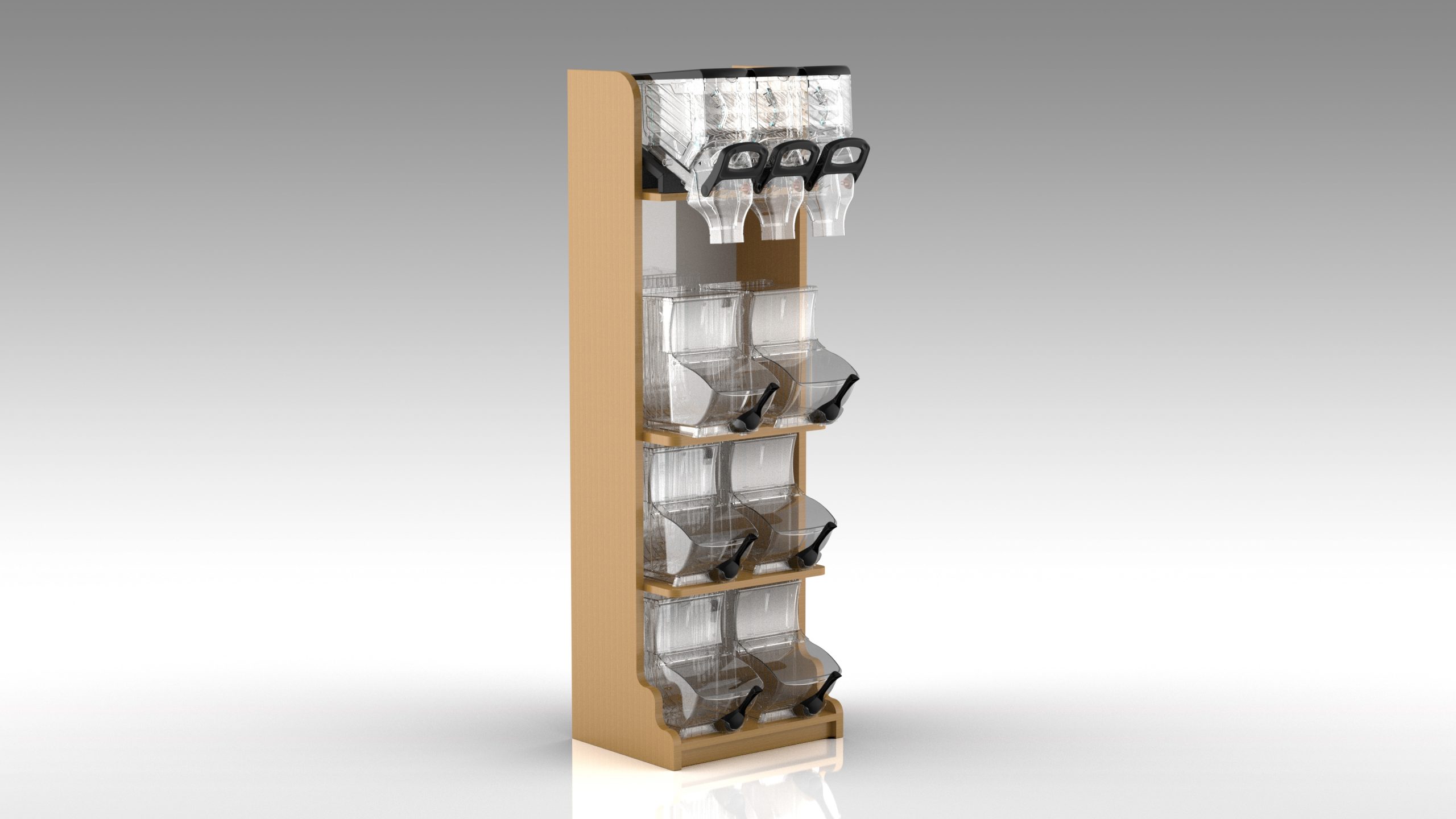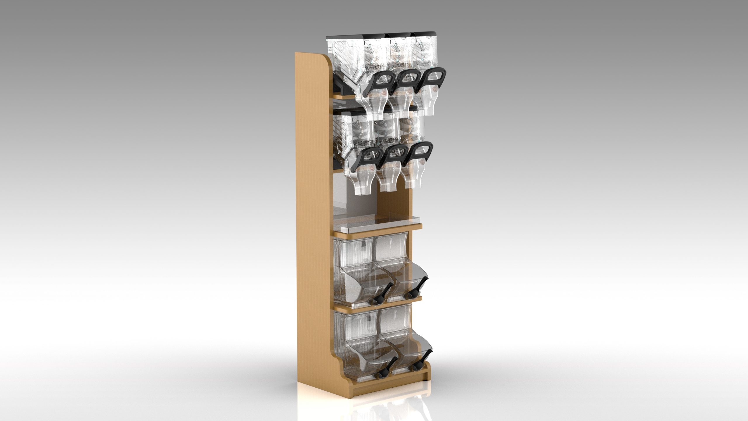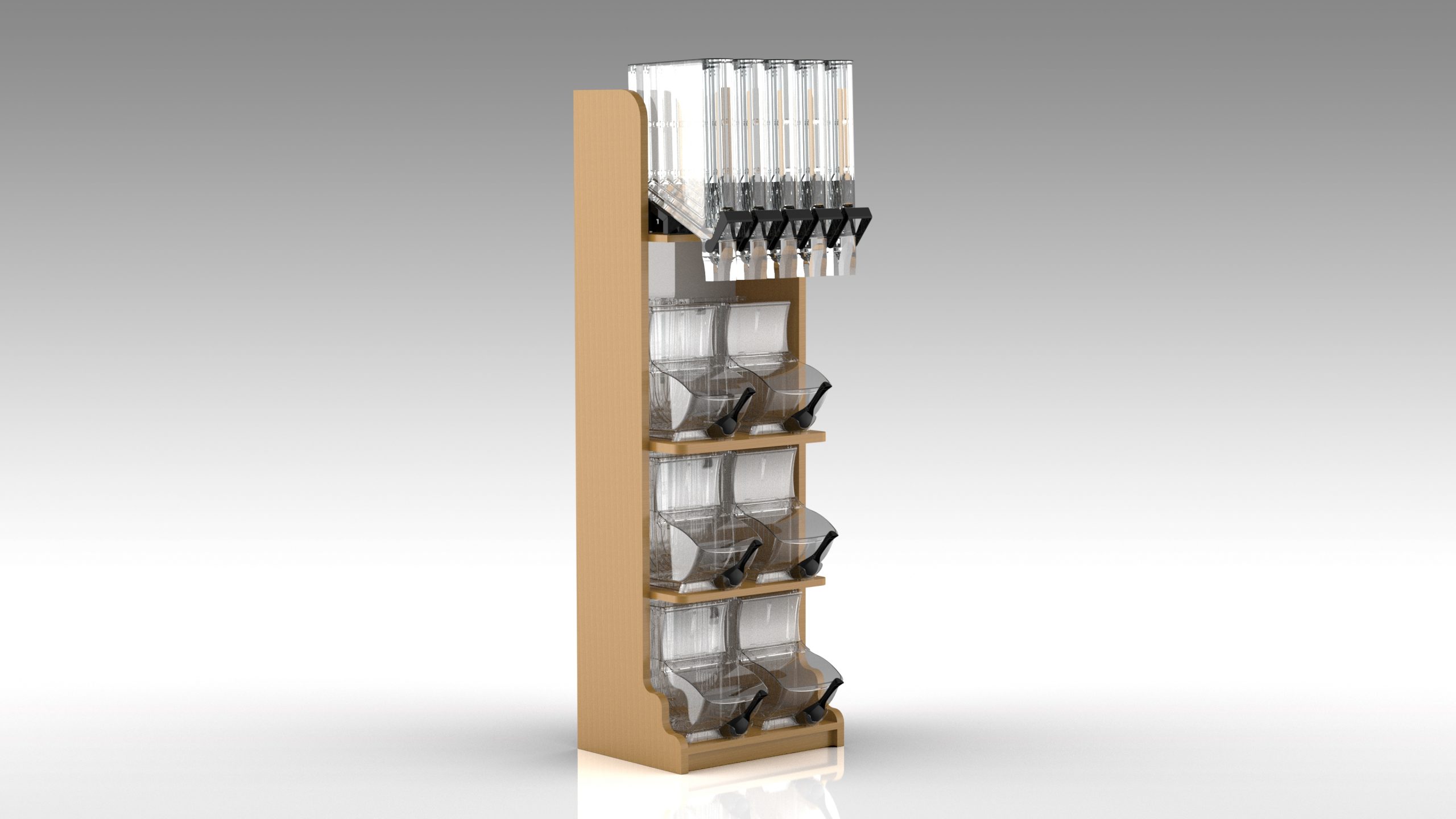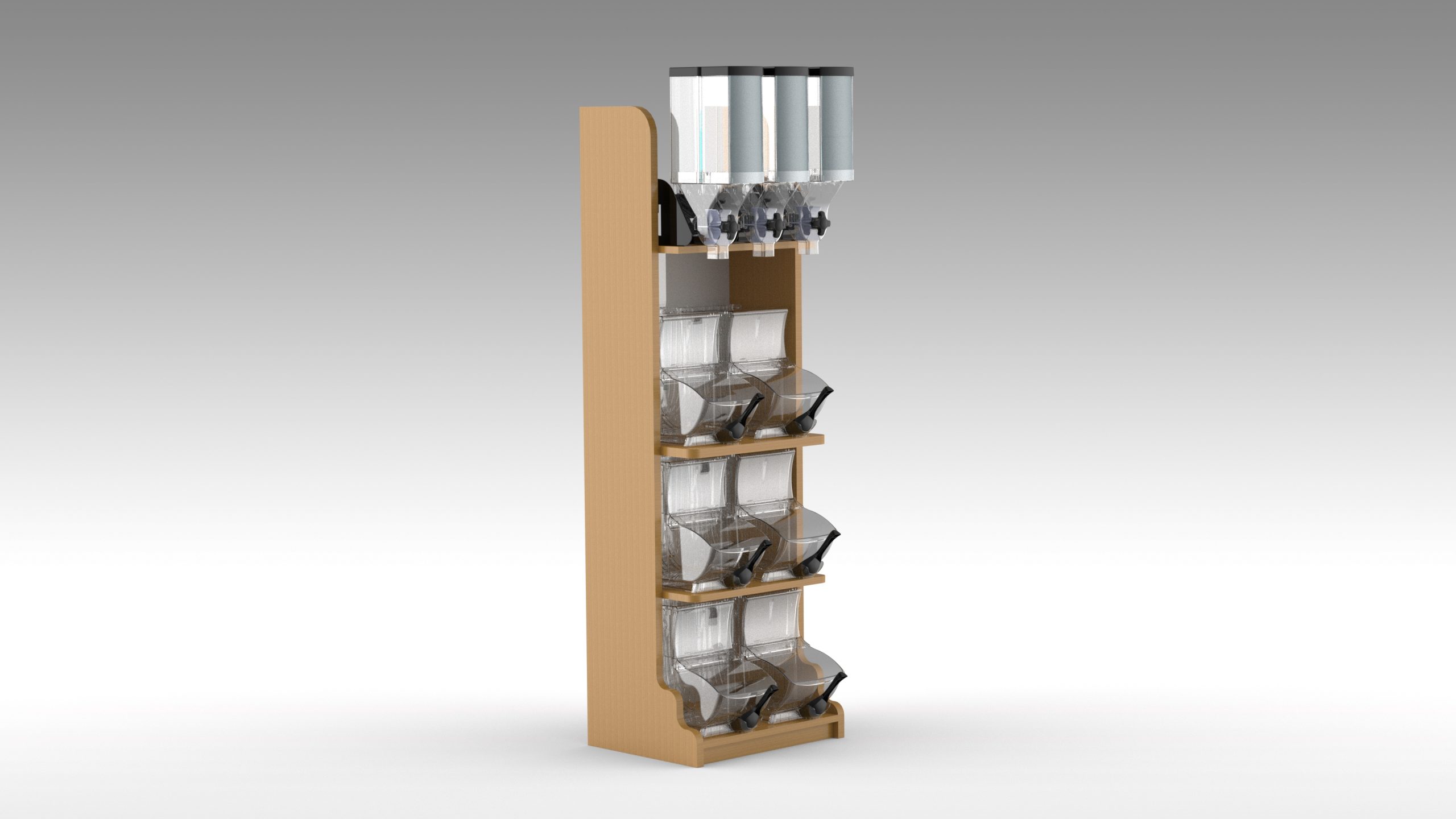 L’étagère TITO permet une mise en place facile et rapide. Elle dispose de plusieurs configurations d’installation offrant la mise en place de distributeurs à poignée, de distributeurs à moulin et de bacs à pelle. Elle se différencie des autres par une structure avec joues ayant plusieurs choix de matière : sapin, épicéa, brut.